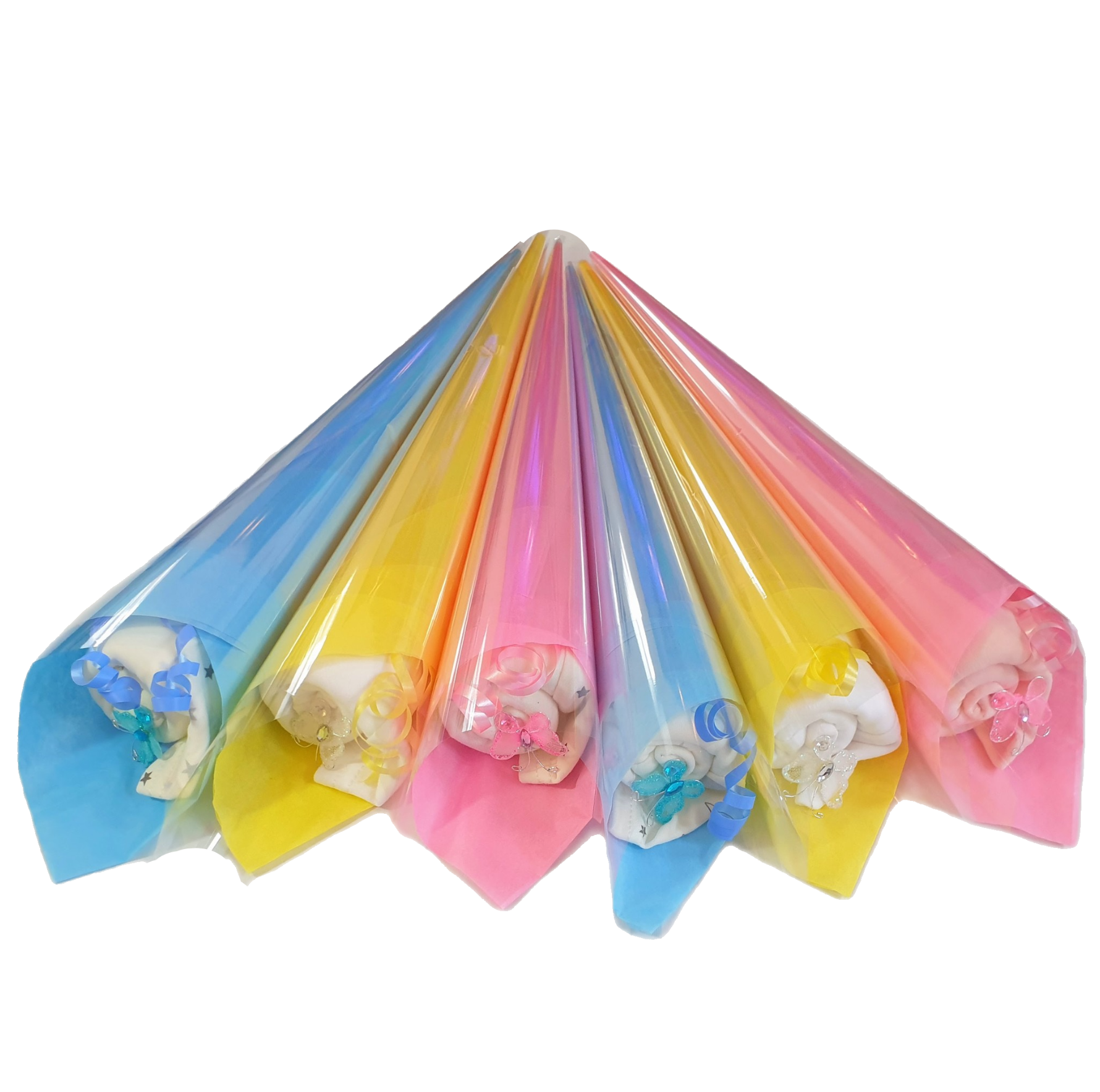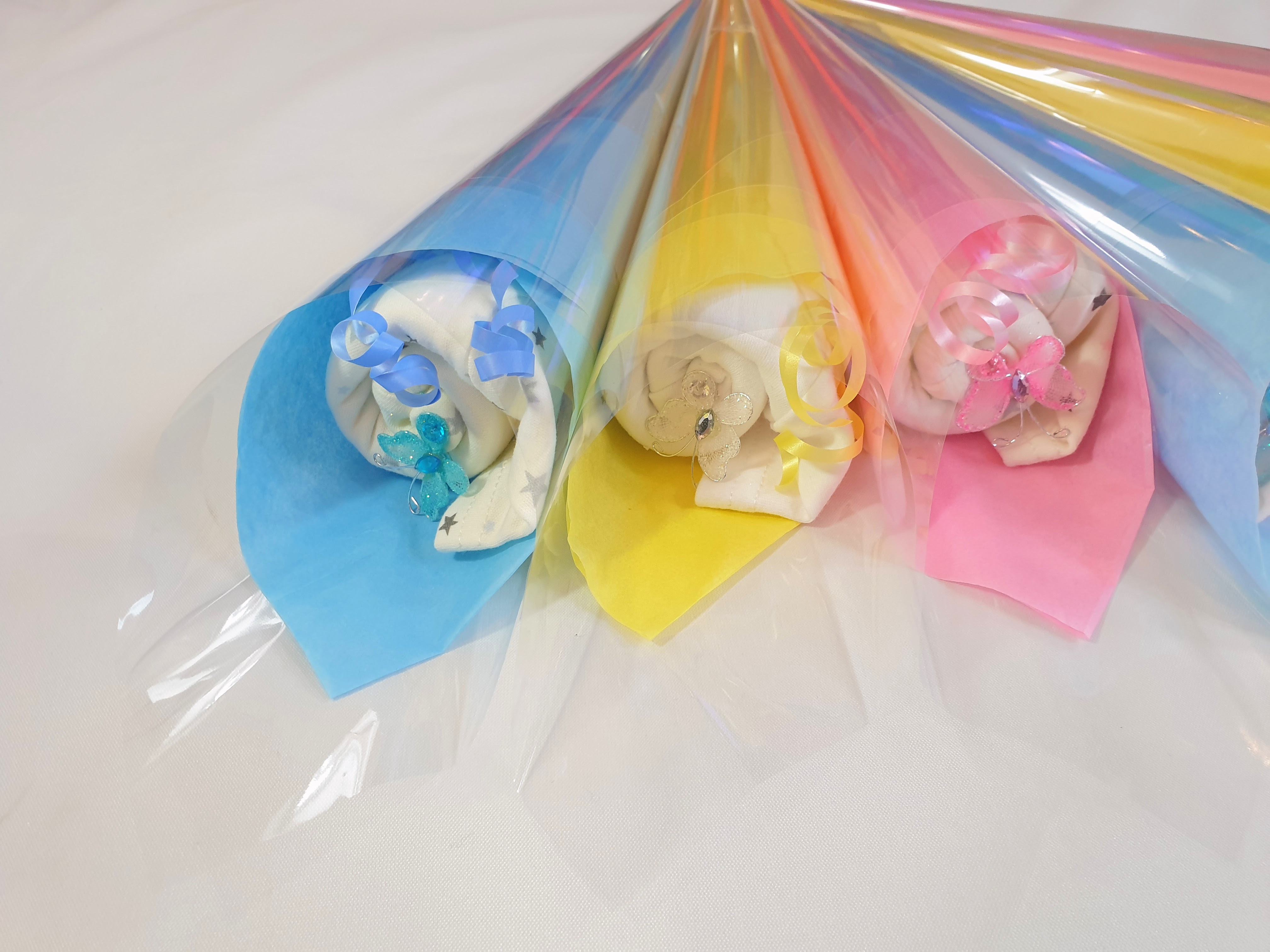 A beautiful baby bodysuit shaped into a rose bud, wrapped in tissue paper and cellophane. A beautiful gift to welcome a new baby into the world. Perfect for baby showers and maternity/paternity leaver gifts.