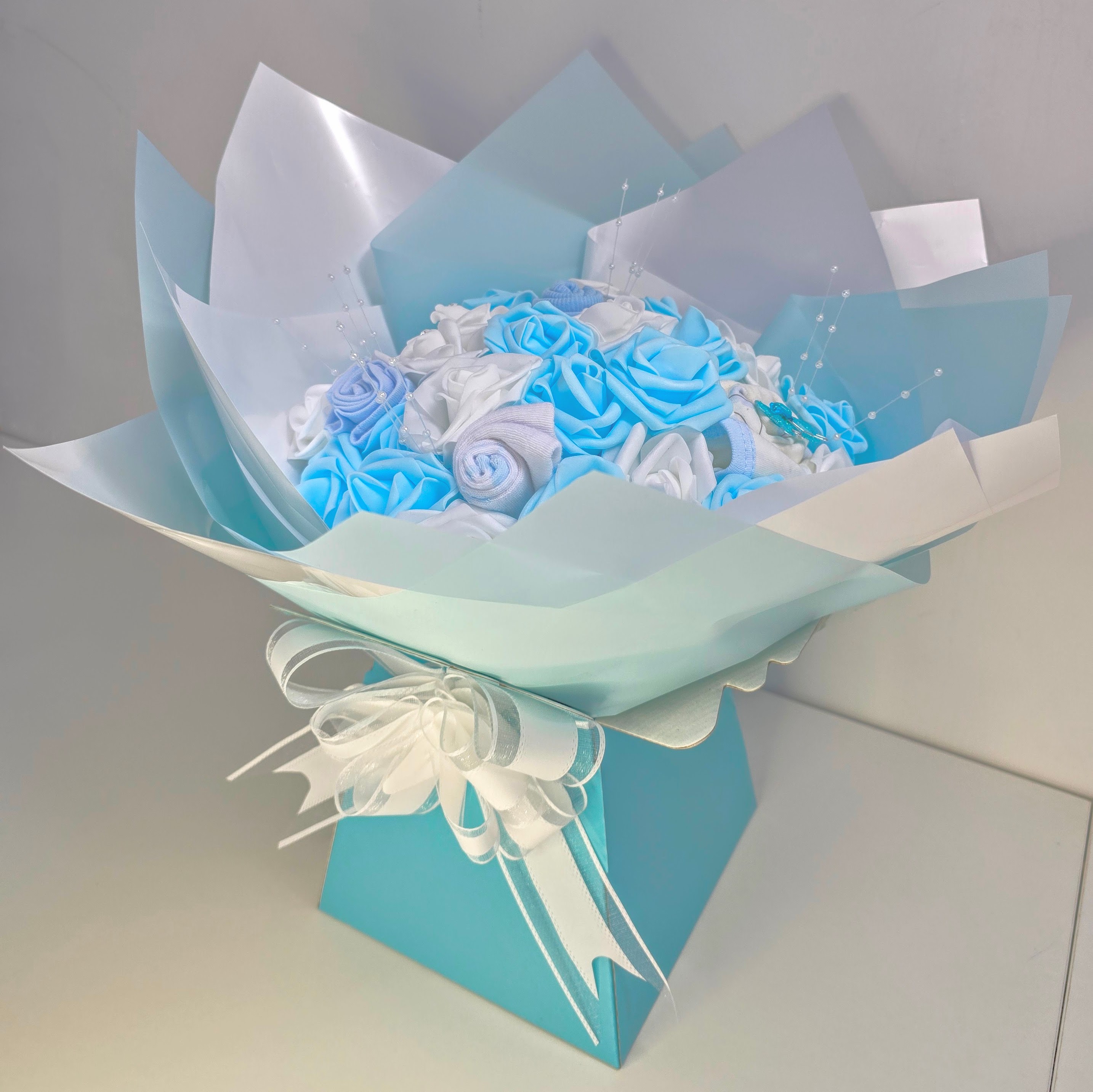 Bouquets include 3-6 months clothing, so they can be kept and not instantly taken apart. Bouquets are displayed in a porto vase with a large bow and placed into a matching bouquet bag with long handles. Including wrap the bouquet is approx 40 x 40cm.