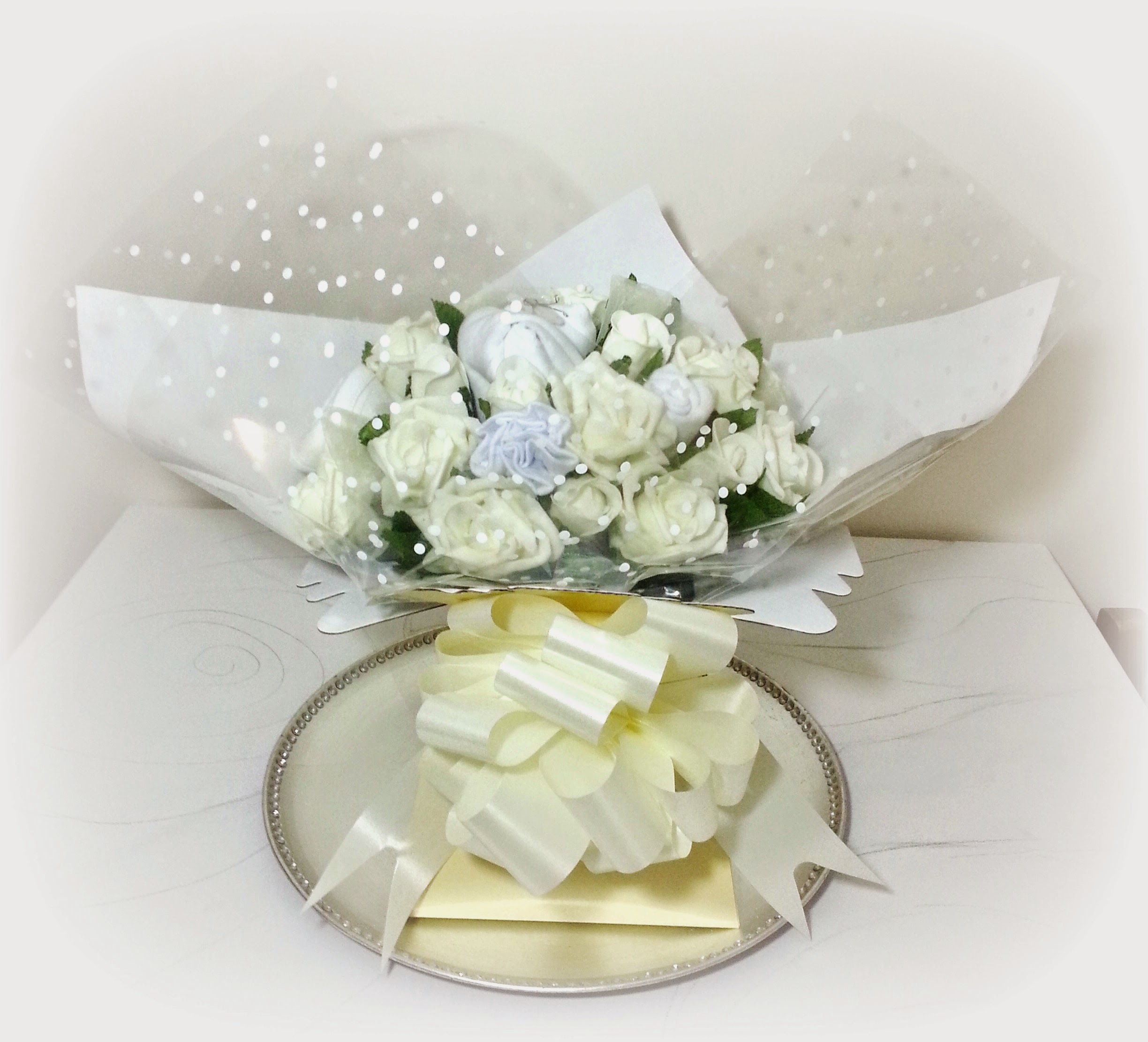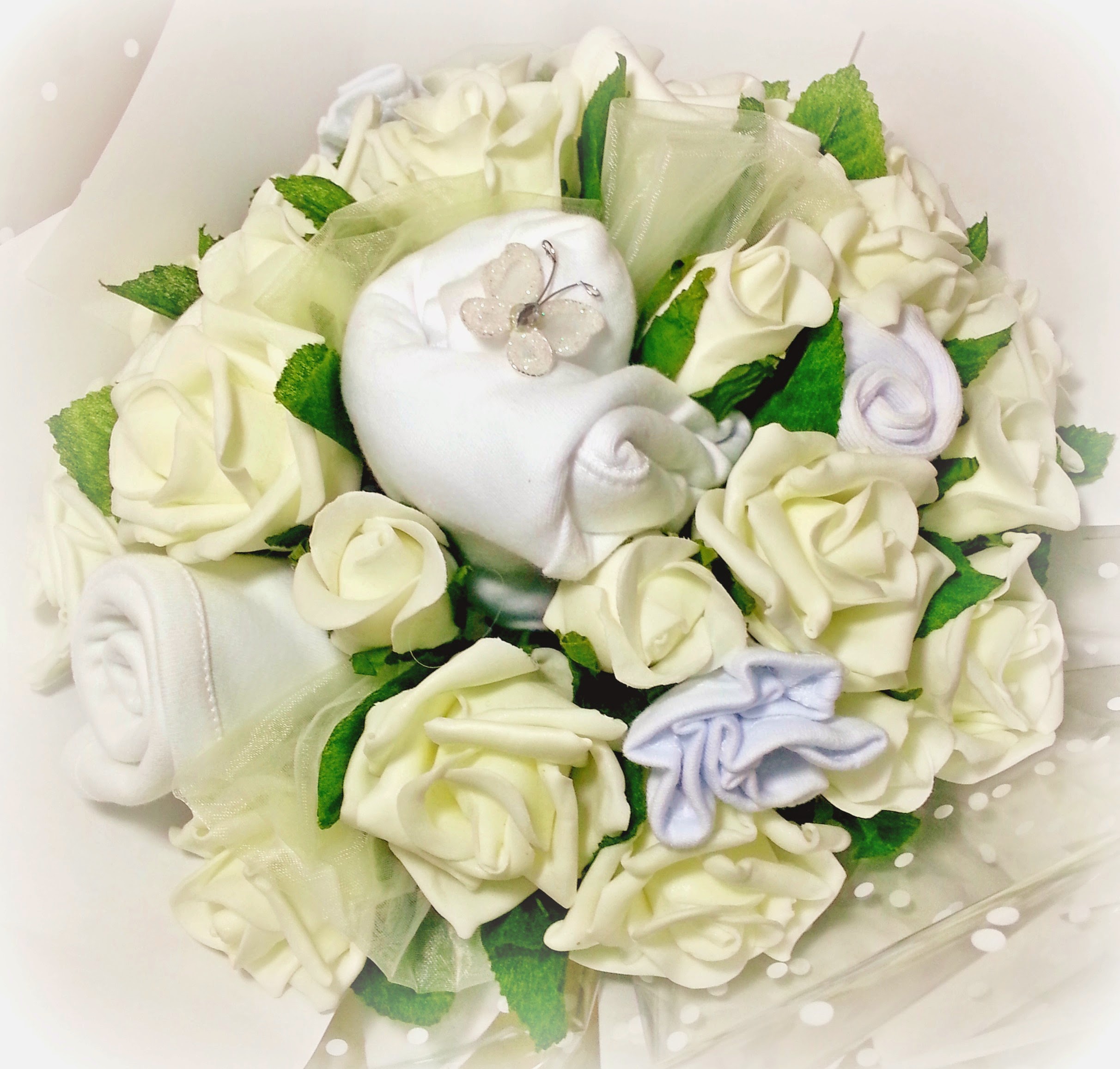 These gorgeous baby clothing bouquets are made to order and completely customizable. Baby bouquets are made with 7cm wide foam roses and rolled baby clothing, displayed as a large bouquet sat in a porto vase with soft matching tissue paper.