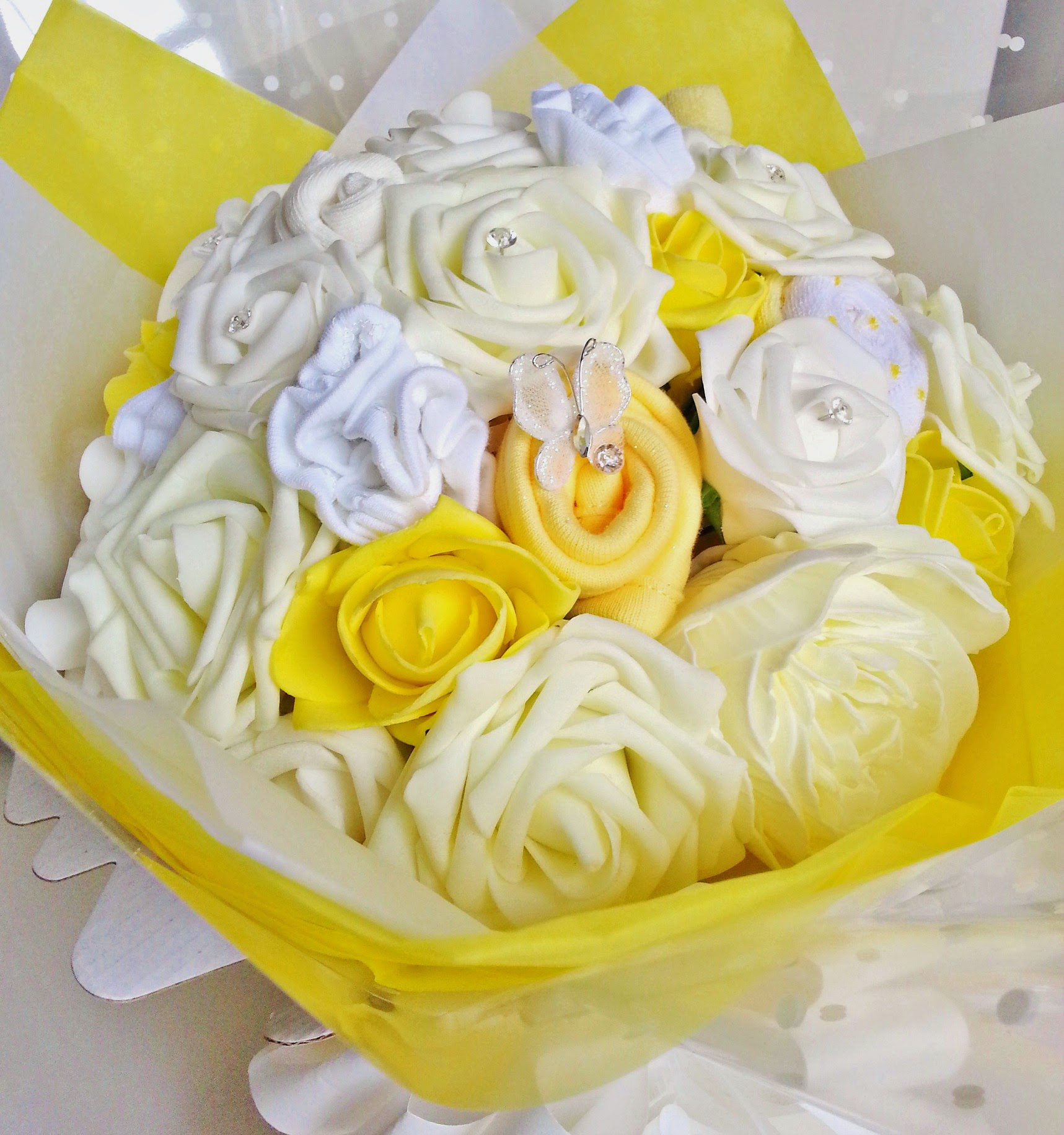 These gorgeous baby clothing bouquets are made to order and completely customizable. Baby bouquets are made with 7cm wide foam roses and rolled baby clothing, displayed as a large bouquet sat in a porto vase with soft matching tissue paper.