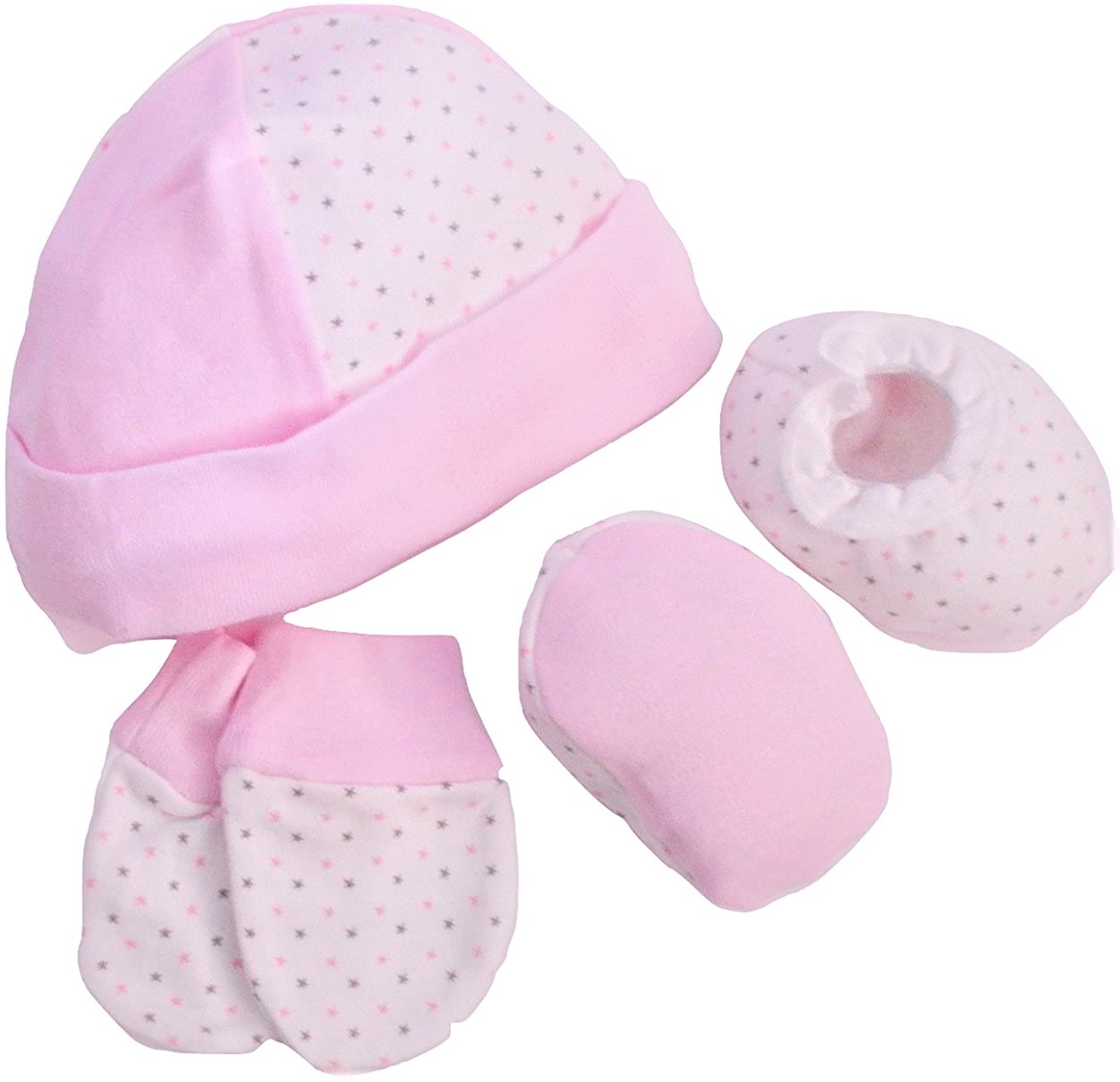 A gorgeous little bundle of baby clothing with a star design wrapped up in a soft organza bag.