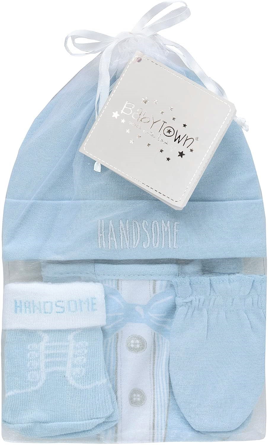 A gorgeous little bundle of baby clothing wrapped up in a pretty organza bag.