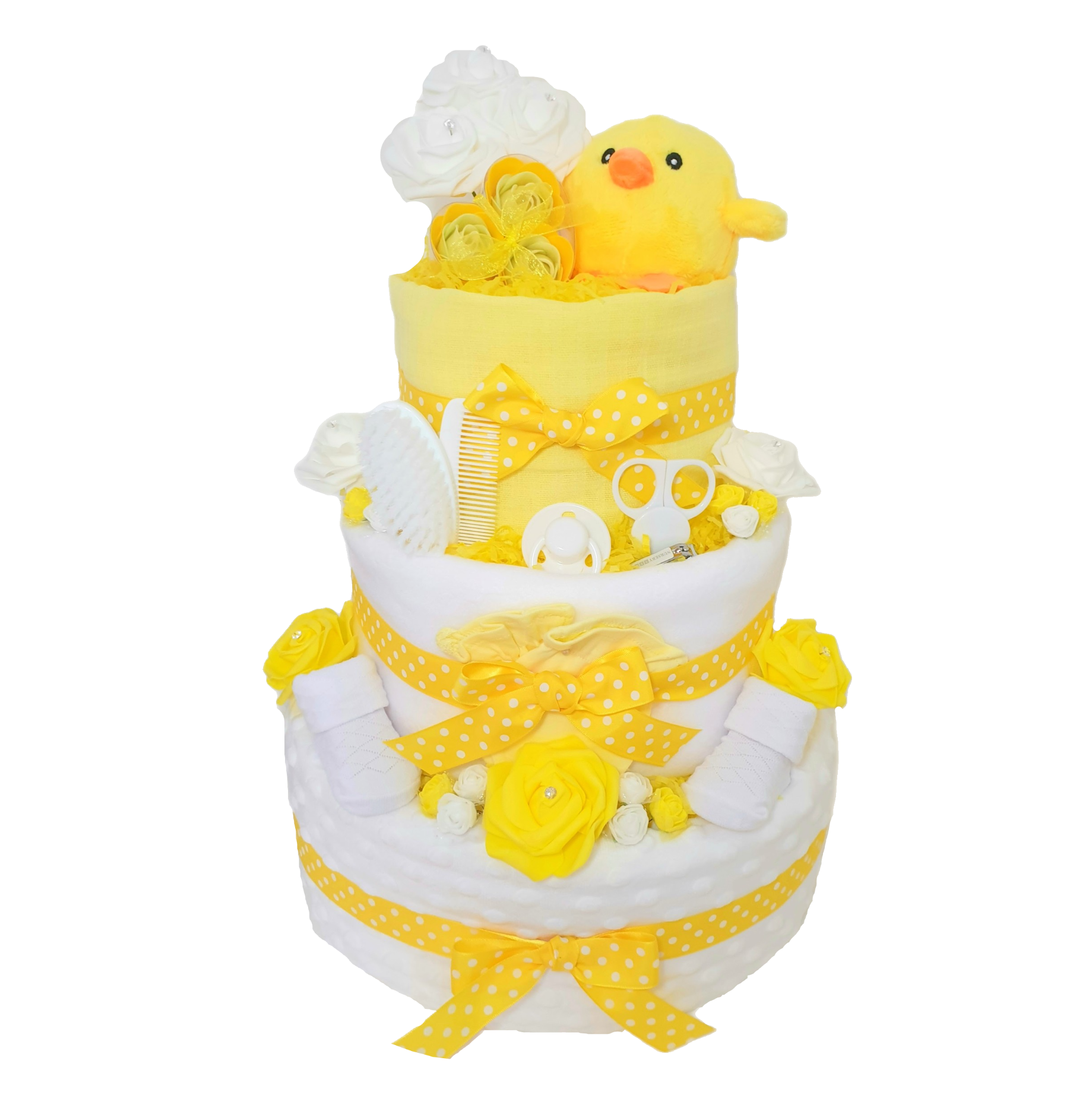 Unisex, neutral gender Nappy Cake in yellow.