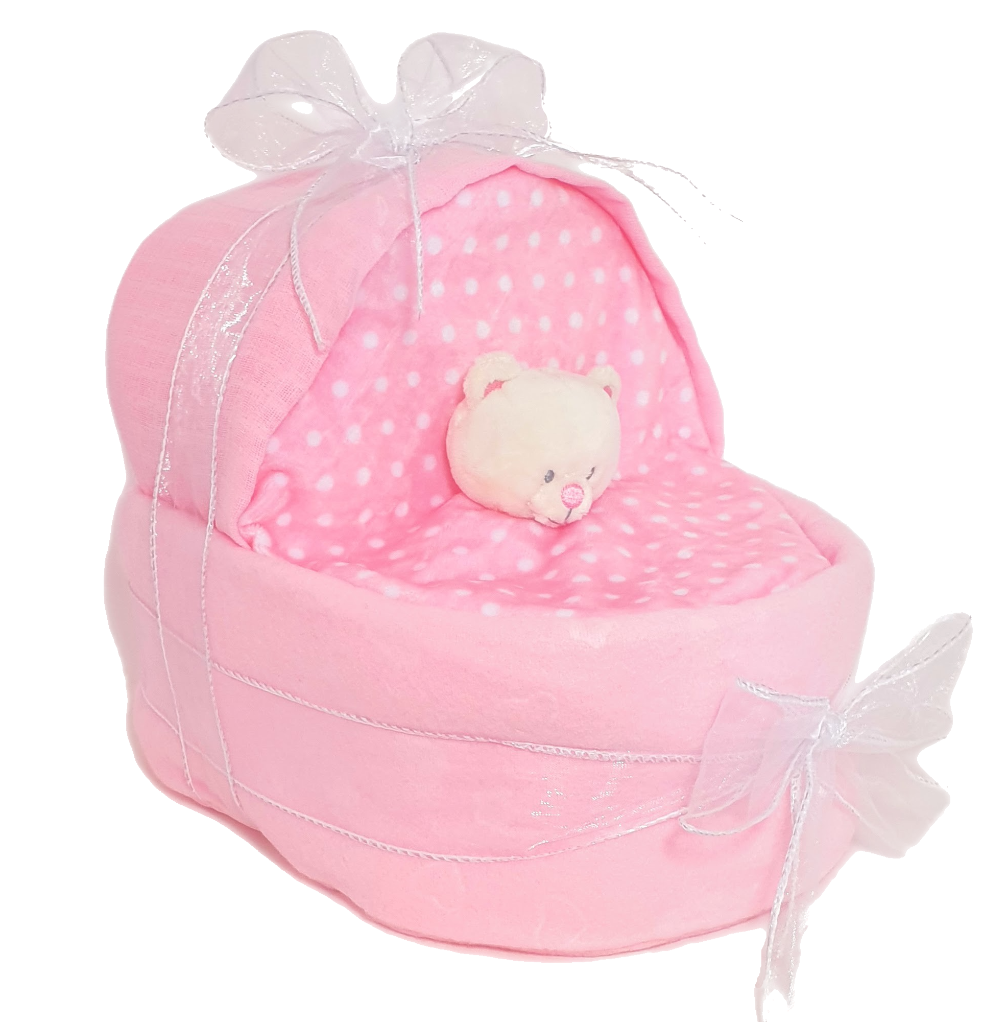 Baby crib nappy cake. This beautiful nappy cake is designed to look like a baby crib or moses basket. Using a baby keel comforter, muslin, blanket and nappies to shape the baby’s bed.